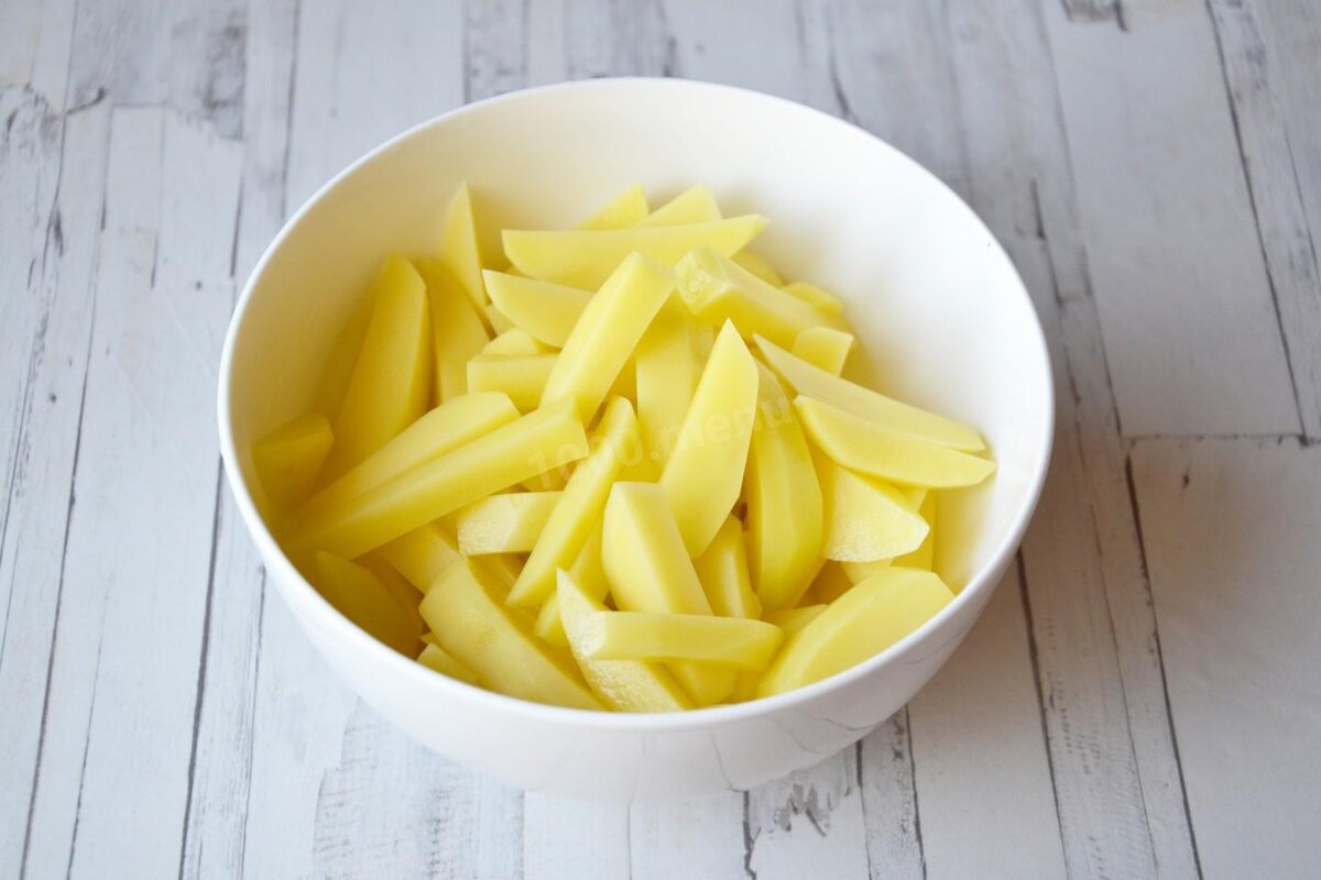 Чистим картофель, нарезаем его кубиками или же дольками. Далее очищенный лук нашинкуем и слегка обжарим его на масле.