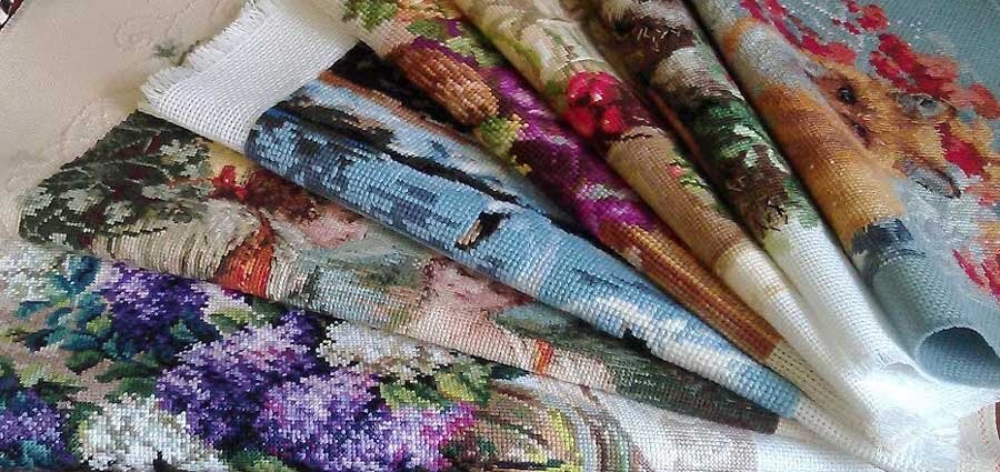 То есть нельзя вышивку складывать, подвешивать, оставлять надолго в пяльцах или раме вышивального станка. Нужно скручивать канву нетугим рулончиком и для этого подойдут разные варианты.