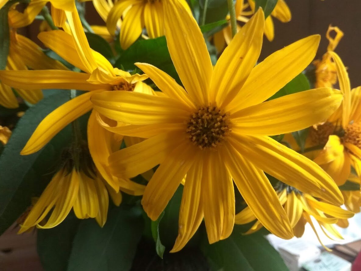Вчера увидела, как соседка срезает секатором желтые цветочки в своем огороде-палисаднике, расположенном у подъезда в наш дом, и явно собирается их выбрасывать Уточнила, могу ли взять. Ее мой вопрос очень удивил, и даже развеселил. Это же топинамбур! - сказала она. Очень выразительно сказала. Как бы давая понять, что только только такая дурочка и невежда, как я могла принять за цветы то, что цветами вовсе и не является. По ее мнению, цветы топинамбура примерно то же самое, что цветы картошки или любого другого овоща. Она просто цветут. И для вазы точно не предназначены. Впрочем, мало ли чудаков на свете (подумала она). Кому-то и это цветы. И радостно отдала мне то, что собиралась выбросить. А я радостно принесла домой и у меня получился дивный солнечный букетик. А уж с учетом серости за окном, вообще просто праздник какой-то! Заодно я узнала, как цветет топинамбур. И еще узнала о нем много интересного. Конечно, название этого корнеплода я и раньше слышала, но никогда не пробовала