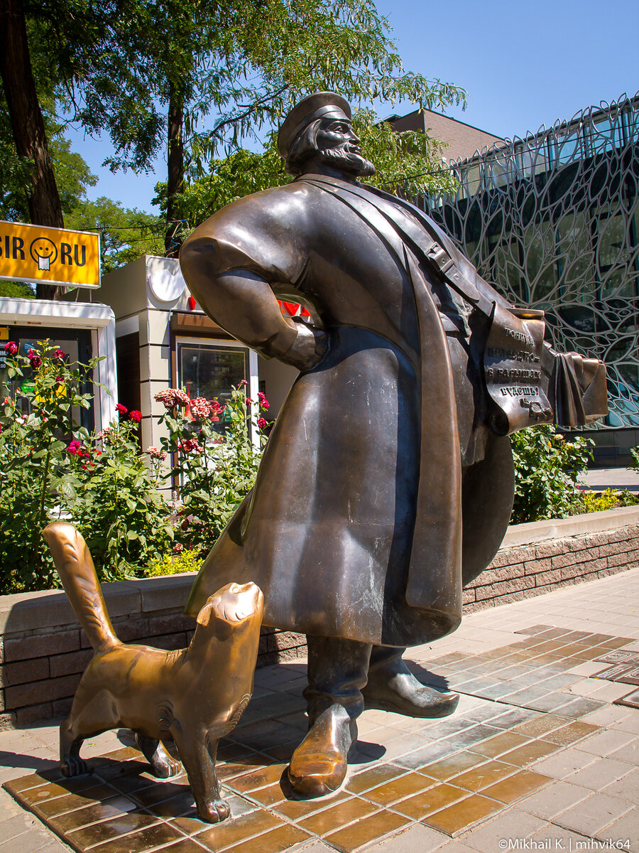 Один из самых известных памятников Ростова-на-Дону - это памятник "Купцу-коробейнику". "Торгуй Праведно - В Барышах Будешь!". Именно такая надпись гласит на коробе данного купца. Расположен памятник на Большой Садовой улице. А из-за рядом стоящей кошки этот памятник в народе прозвали "Купец с котом". Также ростовчане придумали целый ритуал, связанный с этим памятником: необходимо потереть кафтан купца, положить в его сумку-короб монетку, погладить кошку и, наконец, загадать желание, взявшись за большой палец левой руки фигуры. Недалеко расположен еще один памятник с кошкой - памятник "Сантехник с котом". По словам автора памятника, это собирательный образ работника ЖКХ, который часто остается неприметным. А кошка должна ассоциироваться с теплом и домашним уютом Между двумя этими памятники также можно найти вот такой знак "Центр города". Находится на ул. Большая Садовая, рядом с входом в парк им. Горького. А вот еще один памятный знак - план крепости св. Дмитрия Ростовского, находя