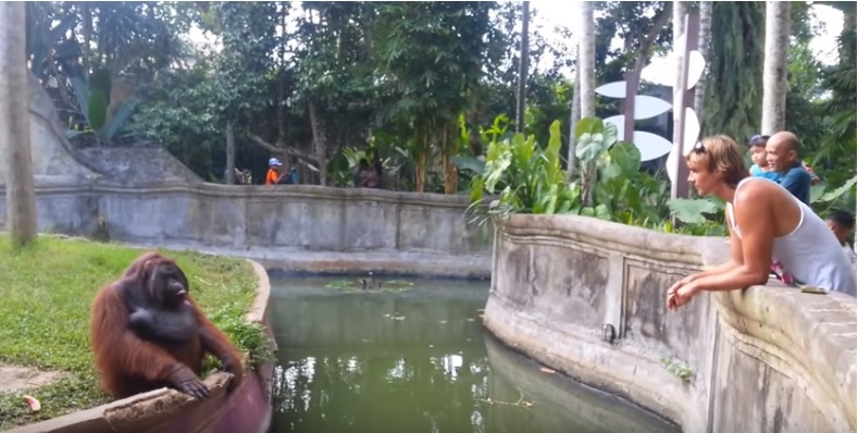 Ролик взят https://www.youtube.com/watch?v=iOTJ0d097oI Видео снято в одном из азиатских зоопарков. Скорее всего действие происходит в популярном. у наших туристов Тайланде. Как обычно, посещая заграничный зоопарк, "дикие русские туристы" начинают дразнить местных животных. На видео показано, как русский турист, бросает какую-то вкусняшку орангутангу и просит бросить, что-нибудь в ответ. Обезьяна явно не дура и понимает на чистом русском языке, бросает в ответ арбузную кожуру, затем ситуация повторяется. Вообще удивляет понимание животными всей планеты, скорее всего это далеко не первые русские с которыми контактировала данная обезьяна...