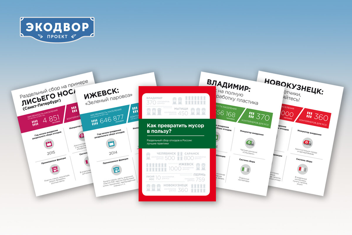 Всероссийский проект “Экодвор” выпустил сборник “Как превратить мусор в пользу?”, в котором собраны успешные практики по внедрению раздельного сбора отходов на уровне муниципальных образований (города, поселка и т.д.). Авторы пособия на конкретных примерах показывают, что раздельный сбор отходов в России не миф, а реальность. Пособие можно бесплатно скачать на сайте проекта “Экодвор”. В работе представлен опыт 10 муниципальных образований, которые отличаются высокой доступностью инфраструктуры раздельного сбора отходов для населения и активной работой по вовлечению жителей в сортировку отходов. Среди них: города Владимир, Ижевск, Новокузнецк, Пермь, Саранск, Челябинск, Кыштым и Озерск Челябинской области, Мытищи Московской области, пос. Лисий Нос в пригороде Санкт-Петербурга. Несмотря на то, что в настоящее время в России захоранивается около 90% бытовых отходов, эти муниципальные образования выбрали путь прогрессивного обращения с отходами и бережного отношения к ресурсам. Помимо