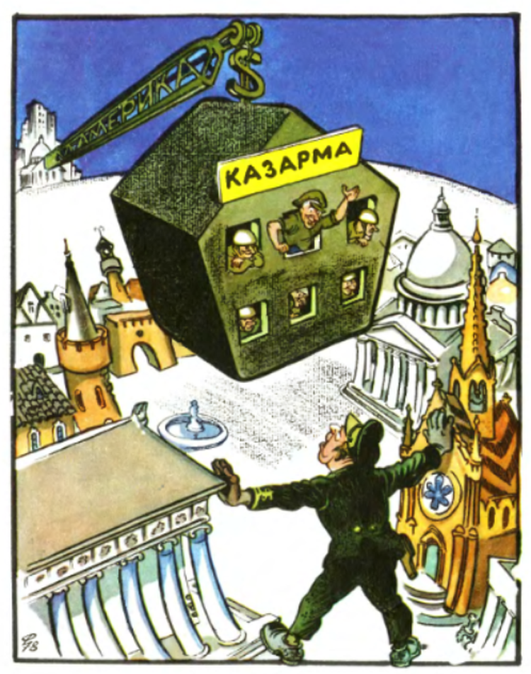 Всем привет! Мы продолжаем серию выпусков, посвященных творчеству советских художников-мастеров карикатурного жанра. Сегодня в центре нашего внимания будут работы карикатуриста-международника Василия Ивановича Фомичева. Его работы публиковались во многих печатных изданиях, среди которых «Красная Звезда», «Гудок», «Известия», «Правда» и «Труд». Кроме того, Василий Иванович много работал на ниве создания сатирических плакатов, входил в состав редакционной коллегии «Агитплаката». Работы Фомичева были оценены по достоинству – в 1966 году он получил звание заслуженного художника РСФСР. Творческий путь карикатуриста продлился свыше пятидесяти лет. Давайте же взглянем на некоторые из его работ. МИЛИТАРИЗАЦИЯ ЗАПАДНОЙ ЕВРОПЫ Советская пропаганда постоянно (и, надо сказать, справедливо) упрекала блок НАТО во главе с США в постоянном наращивании военного контингента в приграничных со странами ОВД государствах, да и вообще во всей Западной Европе. Художник Фомичев увидел этот процесс по-своему и