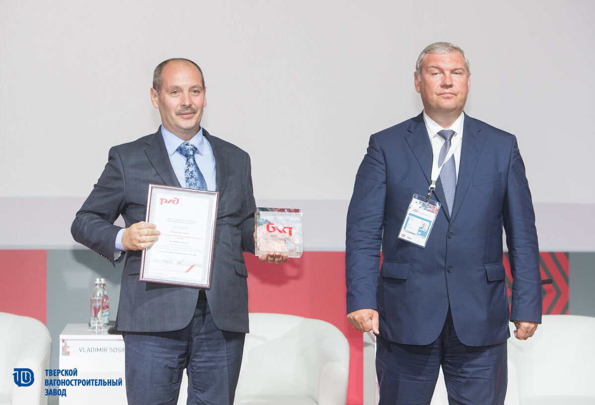 Церемония награждения победителей конкурса, который ОАО «Российские железные дороги» проводит уже в девятый раз, прошла 2 октября в рамках Международного транспортно-логистического форума «PRO//Движение.1520» в Сочи. Награду представителю Тверского вагоностроительного завода Арсену Битжамо, и.о. директора по качеству, от имени ОАО «РЖД» вручил заместитель генерального директора – главный инженер компании Сергей Кобзев.