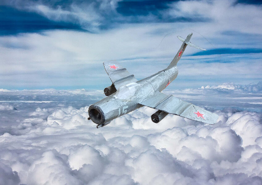 Делаем игрушку для ребенка за пару часов В предыдущем материале я уже рассказал, как вместе с семилетним сыном мы своими руками сделали модель самолета МиГ-19. Теперь сделаем МиГ-15. Материалы - как обычно, из того, что нашлось под рукой: картон (ватман), палочки от роллов, зубочистки, пенопласт, прозрачные клеи «Момент Монтаж», « Деколюкс » и «Титан». В интернете находим картинку-схему МиГ-15. Увеличиваем любым фоторедактором до подходящих размеров на экране. Масштаб мы выбрали 1:64. То есть длина модели и размах крыльев должны быть примерно 156 мм. Фюзеляж фактически состоит из двух конусов. Сворачиваем их и соединяем с помощью пенопластовой «пробки». Наш самолет – среднеплан, поэтому для крыла делаем прорези в фюзеляже с двух сторон и вставляем в них крыло. Крепим клеем «Титан». На крылья сверху приклеиваем аэродинамические гребни. Контуры крыльев, т-образного стабилизатора и киля срисовываем с экрана на простую белую бумагу методом «просвечивания». Вырезаем шаблоны и переноси