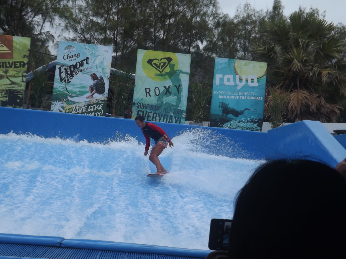 На Пхукете есть школа серфинга Surf House. Стоит большой бассейн с горкой, по ней идет искусственная волна. Стоимость – 1000 бат за час. Людей набирают каждый час. Есть инструктор, который всех по очереди обучает. Как стоять на доске, как двигаться. Сначала дают канат, чтобы за него держаться. Когда появляется уверенность – отпускают без веревки. Большинство новичков, конечно, сразу падает. Когда упадешь – твое место занимает следующий в очереди. Набор идет каждый час, поэтому лайфхак: старайтесь оказаться в группе, где людей поменьше. Тогда будет чаще наступать ваша очередь – большему научитесь. При катании – на Вас не должно быть острых предметов, пуговиц и пр. Муж за один первый час научился стоять без веревки. Потом ему давали задание – присесть на доске и дотронуться до воды. Потом – стали бросать доски, чтобы он через них подпрыгивал. Дочка в этом году тоже в первый раз попробовала (10 лет). Держаться научилась, хотя и с канатом. Рядом расположен бар, звучит энергичная музыка