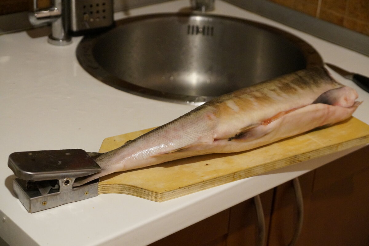 С мужем гостили у знакомых Финляндии и у них подглядела одну шикарную идею, как быстро чистить рыбу большую. Ведь возникает проблема, что когда рыбу чистишь, снимаешь шкуру с чешуей, то неудобно одной рукой чистить, другой пытаться удержать скользкую рыбину. Я обычно у крупной красной рыбы , типа кеты, гольца, снимаю кожуру вместе с чешуей, так быстрее рыбу очистить и чешуя не валяется по всей кухне. Поскольку финны очень много едят рыбы, ловят и перерабатывают сами, давно уже придумали для хозяек удобную доску с зажимом. Увы, там я такую не купила, нашла где-то на просторах интернета в России. Удобно очень, хвост зажал и рука свободна, удобнее двумя руками срезать шкуру, чистить рыбу. Правда, идею российские "умельцы" позаимствовали у финнов, но исполнение ужасное, доска из фанеры, а зажим из плохого тонкого металла. Но все равно стало удобнее чистить рыбу, чем без такой доски. Рыбу я сама солю, кету, горбушу, голец. Кета в приготовлении суховата, а в засолке хороша. Сделал