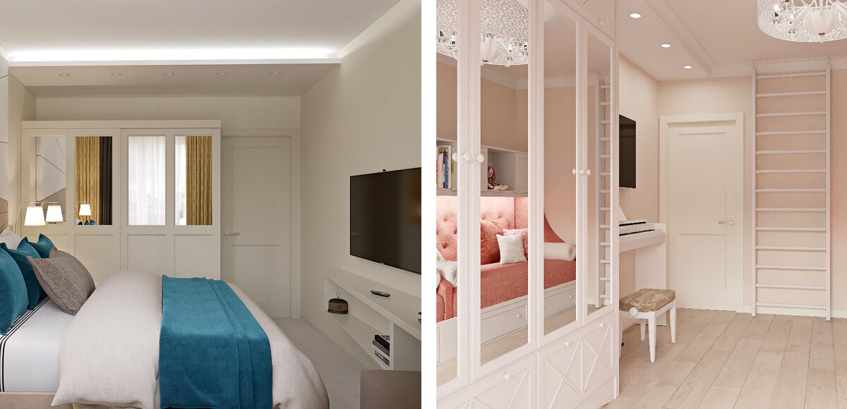 Межкомнатные двери - это та часть дизайн проекта, которой незаслуженно мало уделяется внимания как со стороны заказчика, так и со стороны дизайнера. И хоть они устанавливаются в самом конце ремонта, продумать некоторые вещи обязательно нужно еще на стадии обсуждения проекта. В нашем проекте вот такие белые классические двери. Схема открывания дверей в трехкомнатной квартире Вот, например, посмотрите на типичную схему открытия дверей от дизайнера и представьте, что вам в этой квартире жить, вас ничего не смущает? Обратите внимание куда открываются двери в детских комнатах. В коридор. Это категорически неверно! Почему? Отвечаем. Из практики. По нашему опыту, двери в детскую чаще всего открыты, так как детишки любят бегать туда-сюда. А это значит, что двери скорее всего будут постоянно открыты в коридор и они будут во-первых, представлять опасность для бегающей детворы в виде углов и ручек, а во-вторых, будут перекрывать и без того не сильно широкий проход. Важность 1. По нашей практик