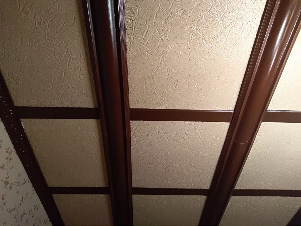 Комната в хрущёвке, которой был нужен ремонт, до смешного маленькая и ещё кривая. Кривое всё: и стены, и потолок, и даже пол. Cтены — особая песня. Бугры и впадины по всему периметру, будто здесь практиковались штукатуры неумехи. Выравнивать раствором долго, да и дорого. Ведь задуман очень экономный ремонт. Хозяева — креативная семейная пара, решили просто замаскировать неровности любыми подходящими строительными материалами. Отправились в ближайший строймаркет и купили махом всё необходимое. В больших строительных магазинах всегда продаётся товар со скидкой. За остатки дорогих обоев заплатили сущие копейки. Понадобилось всего четыре рулона — три в цветочек, мелкий узор отлично скрывает неровности и один фактурный, сочного зелёного цвета. По такому же принципу приобрели ламинат. Тёмно-коричневый, уценённый, последние 4 упаковки. Имитация — дешевле Остался потолок. Идея пришла в голову прямо в магазине — сотворить нагромождение с помощью полиуретановых балок и потолочных плит. Они