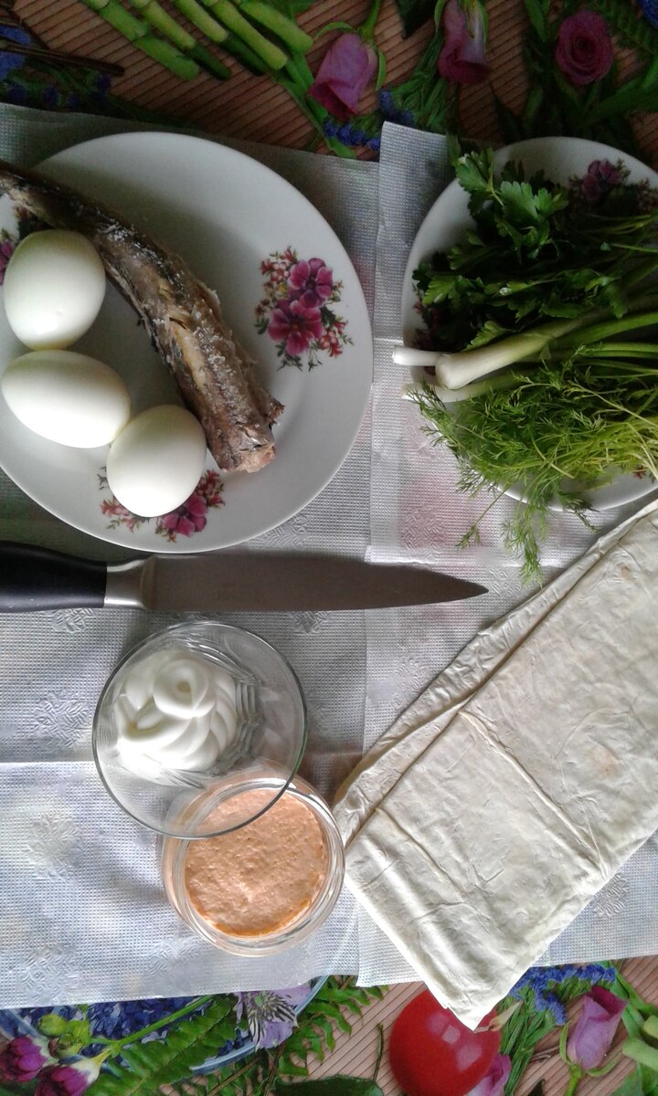 Как основа используется тонкий лаваш, который намазывается рыбной закуской. Сделать это нужно быстро, намазав тонким слоем, чтоб лаваш не размяк. Оговорюсь сразу, приступая к намазыванию нужно подготовить все компоненты заранее, чтобы не отвлекаться на это в процессе приготовления. Итак, взяв в руки лаваш, посмотри по сторонам.