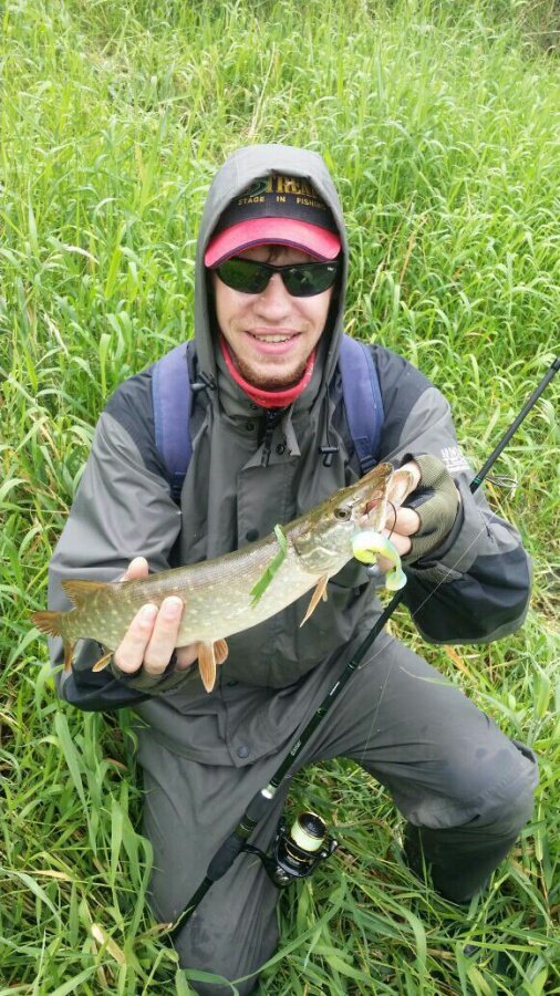 Приехав на место, собрал свой Norstream Rebel 732MMH до 21 грамма, ловить решил начать с воблеров. Пройдя метров 100, поклёвок так и не увидел, и только появилась мысль поменять приманку на джиг, как сразу и закинул свой воблер на куст. Не так хотел я сменить приманку. Перевязался, поставив Akkoi Prime 125мм, и поклёвка не заставила себя долго ждать. Первая щучка есть! Фото и домой, подрастать. А когда ставил ее, думал, не много ли будет для такой маленькой речки. Как оказалось нет, не много.