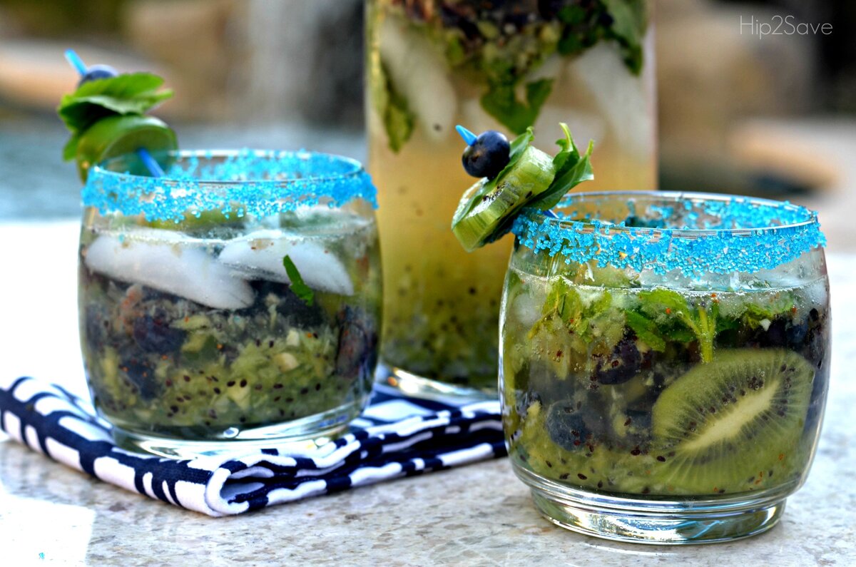 4. В кувшин с киви добавьте лёд, затем распределите слой листиков свежей мяты. Сверху добавьте кружочки киви, подготовленные ранее, слой черничного пюре и снова повторите слой из листьев мяты. В самом конце добавьте несколько цельных ягод черники.