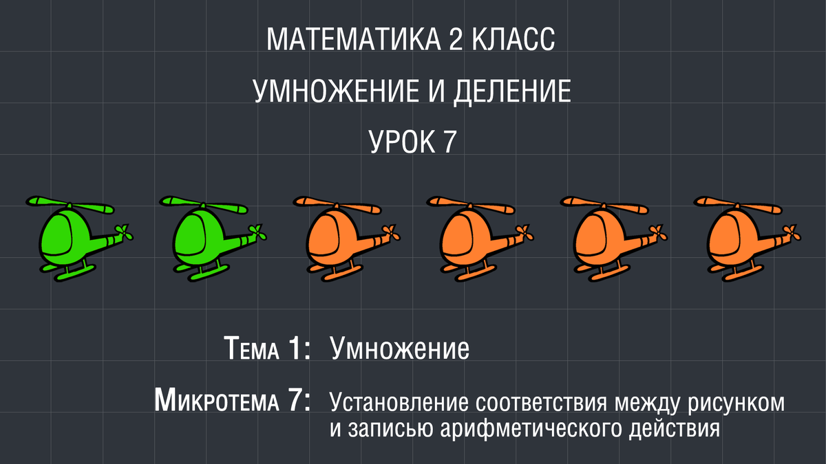 Нам нужно выбрать к рисунку карточку с действием сложения или умножения. Рассмотрим рисунок. Что мы видим? На рисунке мы видим два зеленых и три оранжевых вертолета. Это мы знаем. А что не знаем? Сколько всего вертолетов. Прочитаем записи под рисунком: два плюс три, два умножить на три. Какое решение подходит к рисунку, чтобы ответить на вопрос, сколько всего вертолетов? Два зеленых вертолета и три оранжевых вертолета - это пять вертолетов. Значит, к этому рисунку подходит решение: к двум прибавить три получится пять вертолетов. Как нужно изменить рисунок, чтобы подходила карточка с действием умножения: два умножить на три или по два вертолета взять три раза? Берем два вертолета один раз, два вертолета второй раз. Чтобы получилось по два вертолета три раз, нужно дорисовать один оранжевый вертолет. Сколько всего вертолетов? К двум прибавить два, прибавить два получится шесть вертолетов. Каким одним действием можно заменить сложение одинаковых слагаемых? Умножением. По два вертоле