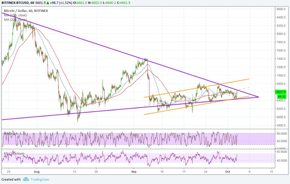 💰Торговые сигналы с заработком от 5% в Телеграм канале Bitcoin отскочил от ранее выделенной ключевой зоны поддержки и снова тестирует сопротивление. Bitcoin торгуется выше внутри восходящего канала на 1-часовом графике, и поддержка, которая совпала с дном долгосрочного треугольника, удерживается еще раз. Цена биткоина сейчас находится в средней зоне интереса канала и устойчивое бычье давление за этой чертой может переместить его выше вершины треугольника. 100 SMA, по-видимому, расположена над долгосрочной 200 SMA, чтобы теперь сигнализировать о том, что путь наименьшего сопротивления в верхней части. Это говорит о том, что сопротивление скорее сломается, чем удержится. Тем не менее, скользящие средние могут просто колебаться, чтобы отразить условия, связанные с диапазоном. Стохастик направлен вверх, предполагая, что покупатели имеют преимущество и могут иметь достаточно энергии, чтобы добиваться больших успехов. Свечи, закрывающейся за отметкой $6600, может быть достаточно, чтобы сигн