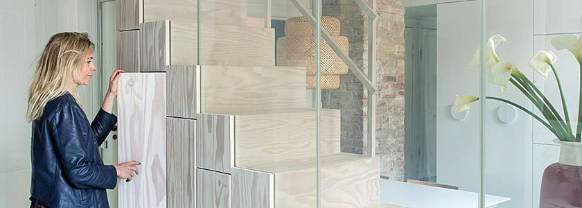 Лестница для большинства загородных жителей – это важный, но обычный элемент дома, с помощью которого можно подняться с первого на второй этаж. Часть застройщиков превращает лестницу в настоящий арт-объект — центральную зону интерьера коттеджа. Дизайнеры из Дании предлагают своё виденье красивой и удобной лестницы. Как обычно, всё началось с идеи. В дизайн-студию обратилась молодая пара, решившая оснастить свою двухуровневую квартиру лестницей. Несмотря на большую площадь, пара решила максимально расширить пространство, не загромождая квартиру лишней мебелью и тяжелыми элементами. Дизайнеры предложили решение — лестница ставится в центре апартаментов (в специально рассчитанный под неё проём). Чтобы место под лестницей не пропадало, её оборудуют системой хранения. Заодно уменьшится количество шкафов в квартире. Кроме этого, лестница, за счёт интегрированной стеклянной перегородки, разделяет помещение на две функциональные части. В одной стороне разместят гостиную, в другой – кухню. Для