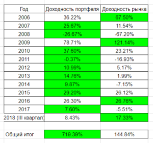 Подведем итоги III квартала 2018 года. Результаты трех портфелей Вавилон РУС – портфель на Московской Бирже за 9 месяцев 2018 года: +8.43% в рублях Состав портфеля на 2018 год Акции в равных пропорциях (доля 50%): Татнефть 3ап , Яндекс, ММК, Энелрос ао, НЛМК, НМПТ ао, Сбербанк ао; Золото (25%): FinEx Gold ETF; Облигации (25%): FinEx FXRB ETF Состав портфеля за прошлые периоды находится здесь. По годам себя портфель ведет следующим образом: Итоги инвестиций по годам Индекс ММВБ за 9 месяцев показывает результат +17.33%, сбалансированный портфель в более скромном плюсе. Есть ещё три месяца, чтобы приблизиться к рыночным результатам. Портфель из зарубежных ETF показывает разнонаправленную динамику в валютах: -1.57% в долларах и +11.94% в рублях. Состав портфеля: FDN – First Trust Dow Jones Internet ETF (доля 15%) FLN – First Trust Latin America AlphaDEX ETF (доля 10%) CWB – SPDR Blmbg Barclays Convert Secs ETF (доля 7.5%) VCLT – Vanguard Long-Term Corporate Bd ETF (доля 7.5%) GLD – SP