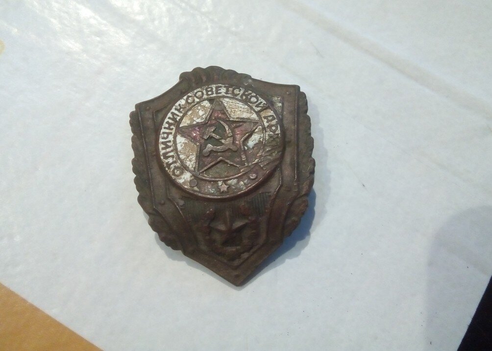 Однажды на обычной дороге я обнаружил втоптанный в землю значок. Оказалось, что это знак "Отличник Советской армии", но только в очень печальном виде. Вот так он выглядит: Я никогда не был отличником Советской Армии, поэтому полез в Интернет за поиском информации по такому значку. Оказалось, что знак этот был учрежден еще в 1957 году. Его цель была - поощрить всех, кто служил в Советской армии за успехи в боевой и политической подготовке, а также за примерную дисциплину. Самое главное - запись о награждении знаком вносится в военный билет. Между прочим, это звание сегодня является основанием для присвоения другого звания - "Ветерана труда", к которому прилагаются соответствующие льготы. Если военнослужащий, получивший знак, вдруг становился нарушителем воинской дисциплины, то знака его могли лишить. Знак оформлен в виде щита, наложенного на венок из дубовых листьев. Ветви венка как бы переплетены лентой. В верхней части находится диск, покрытый белой эмалью, на которой изображена к