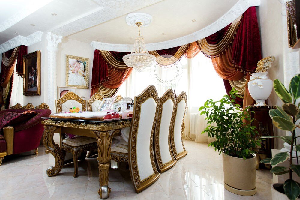 На карнизе Лувр сложнейшая композиция из искусственных цветов и кружева, атласных лент и тафты. Шторы из бархата пудрового цвета с золотым напылением сочетаются с бархатом цвета слоновой кости.