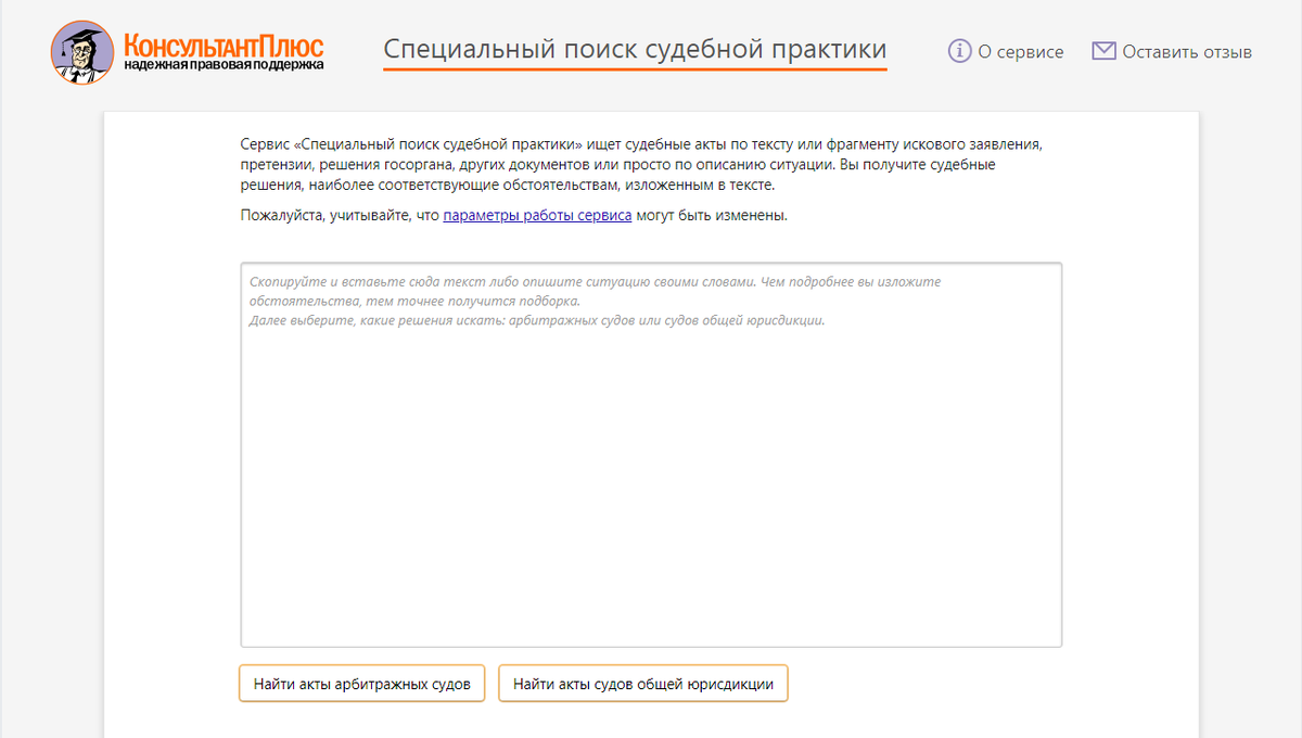 Новый онлайн-сервис "Специальный поиск судебной практики" находит судебные решения на основе фрагмента документа (искового заявления, отзыва на иск, судебного решения и др.) или описания проблемы. Загрузите документ или опишите ситуацию своими словами, и умные технологии подберут судебные решения по образцу. Сервис построен на технологии машинного обучения и совершенствуется с каждым поисковым запросом. "Специальный поиск судебной практики" поможет проанализировать судебную практику, подобрать формулировки для исковых заявлений, оценить перспективы судебного процесса. Поиск возможен по судебным актам арбитражных судов и судов общей юрисдикции. Перейти в онлайн-сервис в системе КонсультантПлюс можно со стартовой страницы профилей "Юрист" и "Универсальный". Подробнее