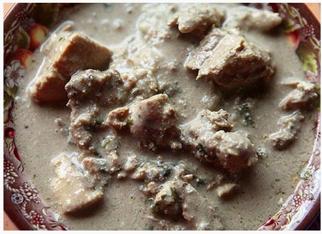 Перемешайте и переложите в курицу. Шафран разведите небольшим количеством бульона и добавьте в курицу. Измельчите чеснок с кинзой и тоже положите к ней. Снова доведите сациви из курицы до кипения и снимите с огня. Ни в коем случае не варите!