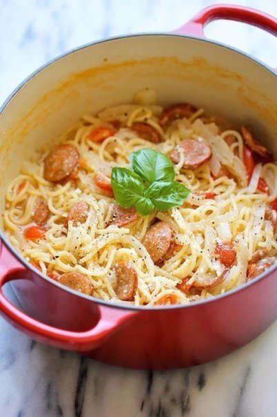Тертый сыр — 1 стак. Приготовление: 1. В большую кастрюлю налить воду и поставить на средний огонь, выложить спагетти, колбасу, лук, помидоры (предварительно нарезать), базилик, чеснок. Приправить солью и перцем по вкусу.
