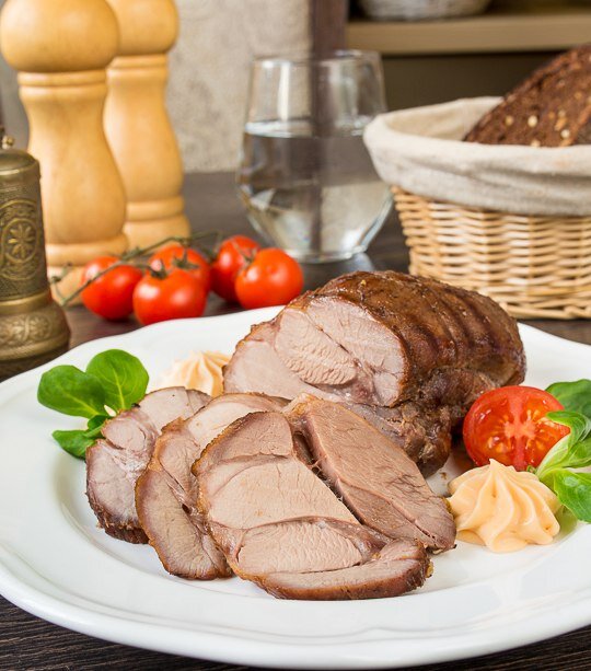 Перекладываем на противень и отправляем в предварительно разогретую до 200 градусов духовку и запекаем около 40-60 минут в зависимости от размера кусков. Температура по термометру-щупу - 72 градуса. Сок, вытекающий из прокола ножом, должен быть прозрачным.
