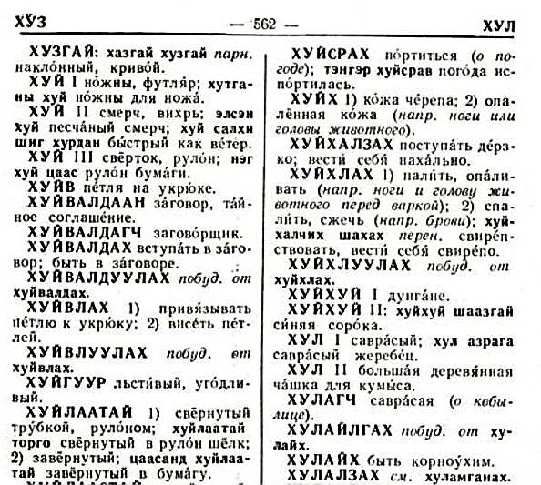 Аналогичные исследования рассматривают слова, восходящие к праиндоевропейскому корню *skēu- (быть острым), встречаются и в других языках: в литовском skuja («хвоя»), в албанском hu («кол», «половой член»). Согласно В. М. Иллич-Свитычу, праславянский корень восходит к праностратическому *cujha «колючка растения, острие», к тому же корню восходит, например, слово «čüä» (пенис) в уйгурском языке. (выделено мной)Ну вот, такое интересное слово, а наука перед ним пасует! Но патриоты не сидят сложа руки и считают слово ХУЙ исконно-посконным, что, впрочем, ожидаемо. Есть и другая расхожая версия, которая отсылает к любопытным страницам монгольско-русского словаря: