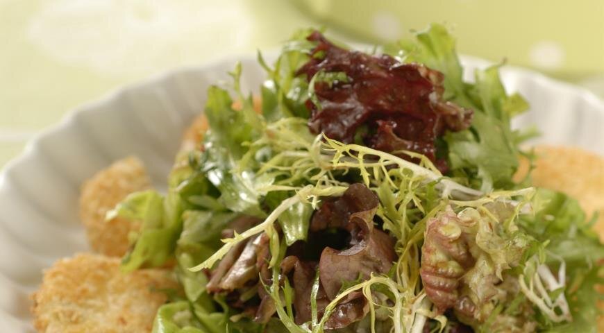 Для заправки смешать лимонный сок, горчицу, оливковое масло и соль.