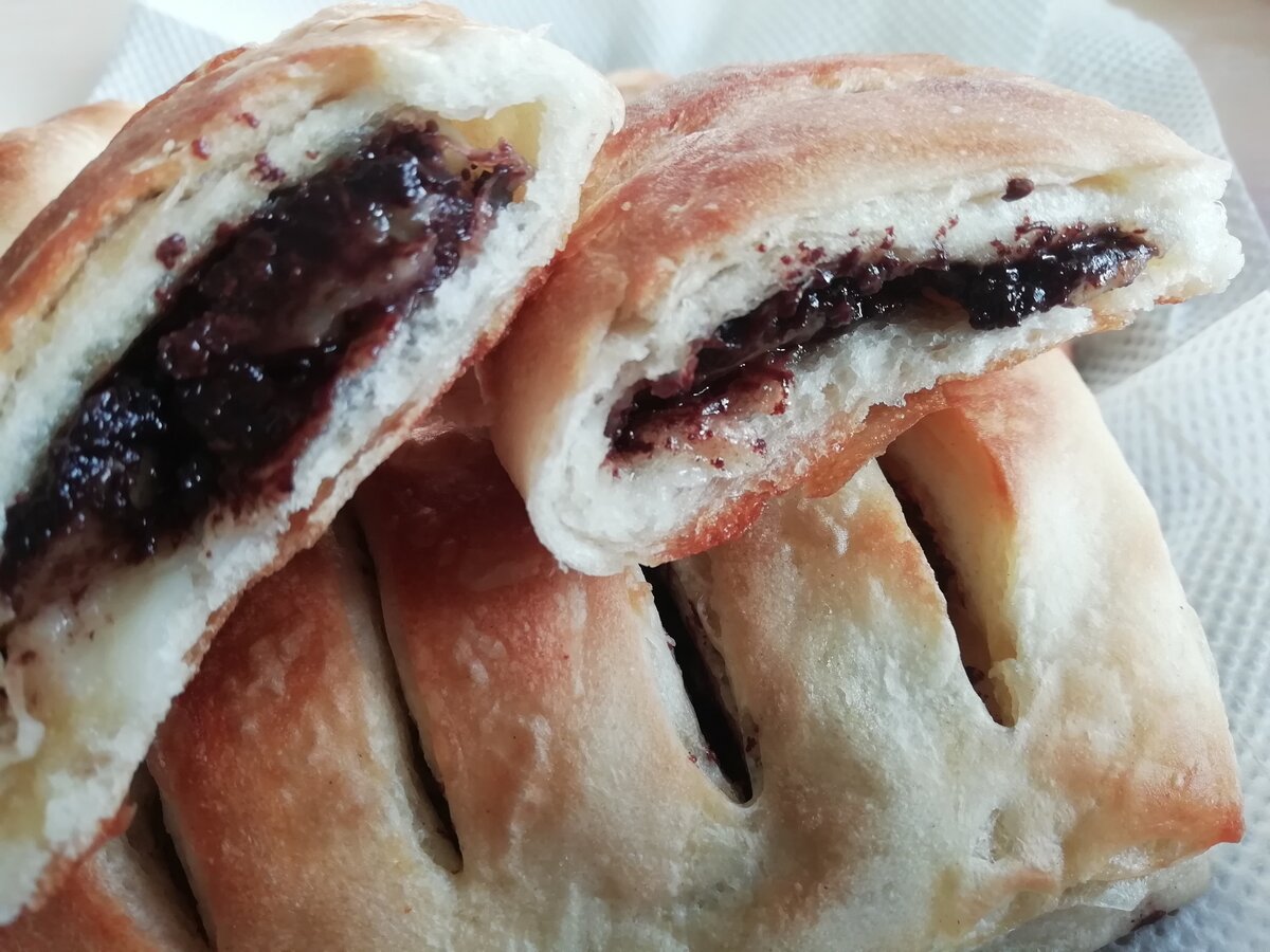 Еще один вкусный и простой десерт из готового слоеного теста - аппетитные, румяные слойки со спелым бананом и горьким шоколадом. Такой десерт находка для случаев когда хочется побаловать себя чем-нибудь вкусненьким, но не хочется много времени проводить на кухни. Ингредиенты: Дрожжевое слоеное тесто 500 гр Бананы спелые 3-4 шт Половина плитки темного шоколада Приготовление: Бананы чистим и режим на кружочки шириной около 1 см. Половину плитки темного шоколада трем на крупной терке. Пласт слоеного теста раскатываем толщиной 0.5 см и разрезаем на прямоугольники 10*12 см. Берем один прямоугольник на одну половину теста выкладываем 5-6 кружочков банана и посыпаем тертым шоколадом (1-2 ч.л) на другой стороне делаем ножом 3-4 надреза. Накрываем начинку тестом с надрезами и хорошо защипываем края. Чтобы края теста лучше склеились, можно по периметру провести пальцем смоченным в воде. Выкладываем слойки на противень смазанный растительным маслом и выпекаем в разогретой до 200 С духовке 10-12