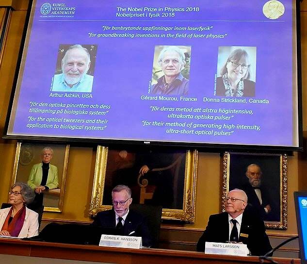 Вторую часть Нобелевской премии комитет решил «разделить» между Жераром Муру (Франция) и Донной Стикланд (Канада), придумавшими в 1985-м каким образом можно повысить мощность лазеров.