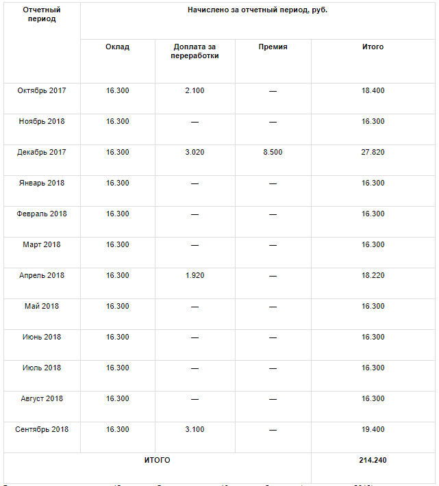 За расчетный период Федотову выплачивалась зарплата в сумме 18.050 руб./мес., по итогам 2017 года выплачена годовая премия – 6.300 руб.