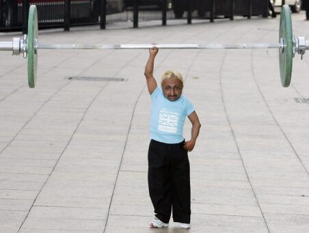 Речь пойдет об индусе Адитья Деве с романтическим прозвищем Ромео, который родился в Панджабе в 1988 году с диагнозом дварфизм (карликовость), но несмотря на это смог доказать всему миру, что сила духа при желании может запросто победить слабость тела, став бодибилдером, попавшим в Книгу рекордов Гиннеса, как самый маленький и слабый физически спортсмен. Отвечая на вопрос о том, какой человек слабый, можно привести в пример людей, страдающих от таких недугов, как дистрофия, миастения (патологическая слабость мышц) и анорексия, однако таких пациентов очень много и к каким-то особым рекордным достижениям они не имеют ровным счетом никакого отношения. То есть, статус самого слабого человека в мире еще нужно заработать и малыш Ромео безусловно заслуживает этого титула, тем более, что его никогда не оскорбляли, ведь с самого детства Адитья Дев успешно боролся с комплексами и пользовался успехом в дружбе, благодаря своим человеческим качествам. Что касается параметров звезды бодибилдинга