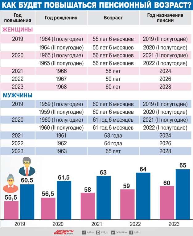 Для тех, кто родился ранее указанных годов, повышение пенсионного возраста будет происходить поэтапно, в т.н. переходный период - с 2019 по 2023 год. Вот, как это будет происходить: