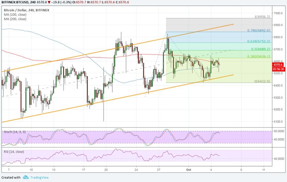 💰Торговые сигналы с заработком от 5% в Телеграм канале Цена биткоина все еще отскакивает от нижней части растущего канала и продолжает подъем. Цена биткоина нашла поддержку в нижней части восходящего канала, как мы видим на 4-часовом графике пары, но, похоже, ударяется о восходящий барьер. Цена отступила после тестирования ближайшего уровня расширения Фибоначчи на $6626,3, возможно, благодаря очередному спаду поддержки. 100 SMA расположен ниже долгосрочного 200 SMA на этом графике, так что путь наименьшего сопротивления лежит в обратную сторону. Это означает, что поддержка с большей вероятностью сломается, чем удержится, что, возможно, приведет к развороту от подъема. Тем не менее, разрыв между скользящими средними сузился, что сигнализирует о замедлении медвежьего импульса и возможном движении вверх. Если это произойдет, биткоин может продолжить движение к следующей цели роста на уровне 50% или отметке $6700 вблизи области интереса среднего канала. Более сильное бычье давление може