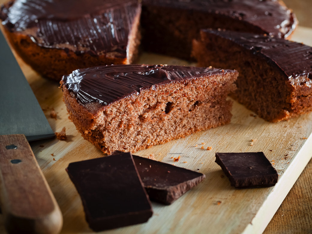 Растопить на водяной бане горький шоколад и оставшиеся 50 г сливочного масла. Для этого налить воды в чашу мультиварки, включить режим «Мой рецепт plus (мультиповар)» и установить температуру 160°C, когда вода закипит уменьшить температуру до 100°C и установить емкость меньшего размера с шоколадом и маслом. С помощью кулинарной кисточки смазать кекс шоколадом. Дать глазури застыть. Шаг 6