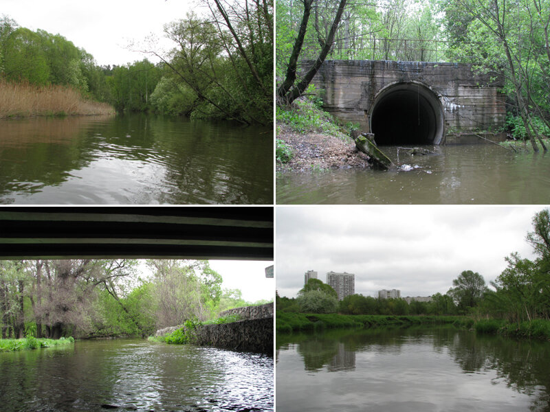 Сплавился по Сходне от ст.Новоподрезково до ст.Трикотажная Середина мая, воскресенье. Пасмурно, накрапывает дождь. Что делать?.. Самое время сплавиться по Сходне! Все шашлычники сидят дома. Уровень воды всё ещё выше летнего и позволяет проскочить чуть ли не половину завалов. А зелень уже вовсю распустилась и скрывает часть населёнки.