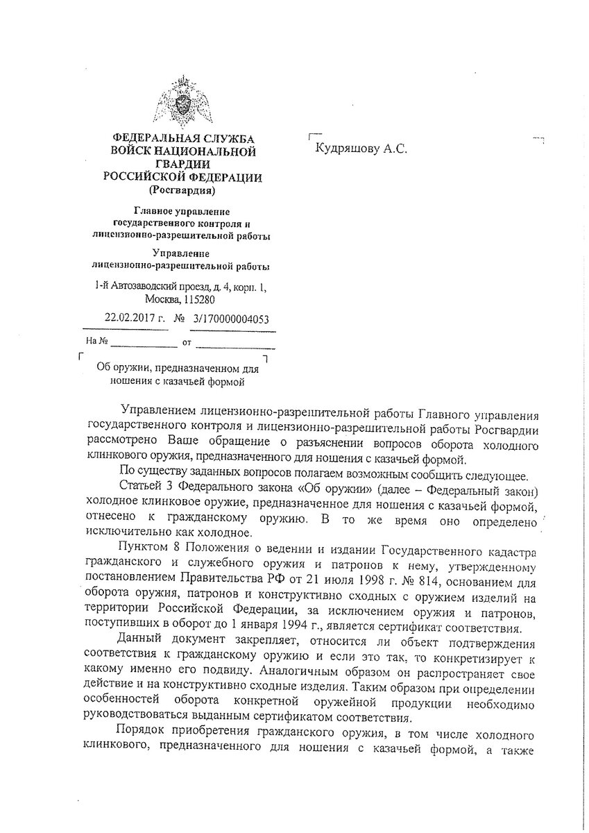 У меня сложилось впечатление что мало кто представляет правила оборота длинноклинкового оружия (сабель и шашек). В различных документах и законах есть упоминание о «холодном оружие которое носится с казачьей формой одежды», но сведения эти разбросаны по многим источникам и не обобщены, кроме того некоторые высказывания допускают двойное, а то и тройное толкование. Проблема не только, и не столько в том, что их трудно найти, проблема - как их правильно толковать? Среди любителей оружия выработалась практика составлять запрос в официальный орган власти, сегодня это Росгвардия, и их интерпретацию считать правильной и окончательной. По этому пути решил пойти и я, было составлено следующее письмо: «Членам казачьих обществ разрешено ношение холодного клинкового оружия. К сожалению, в последнее время, возникают недоразумения связанные с этим правом, в связи с чем просим разъяснить следующие вопросы: Официальный ответ будет прикреплён в конце статьи, он интересен и достаточно исчерпывающий, но