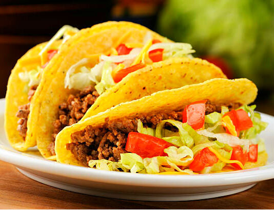 3. Если нет тако лепёшек. Берем лаваш, нарезаем лепешки диаметром 20см. Разогреваем духовку до 190 градусов, вешаем лепешки на два деления решетки. Готовим до золотистой корочки(минут 7-10). 4. В тако лепешки выкладываем готовый фарш, сверху добавляем помидоры и салат. Перед подачей обсыпаем сыром. Приятного аппетита!