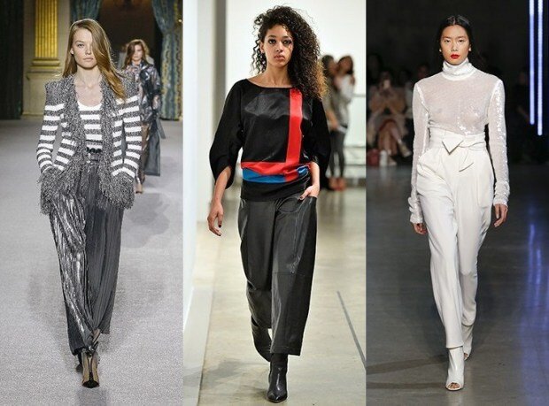 Эстетика 80-х годов не замедляет темп, приобретая все большую популярность в каждом сезоне. В осенне-зимний сезон расклешенные брюки с бедра 2018-2019 гг. Снова приобрели статус обязательного. Вариант на брюках палаццо позволяет нам расширить использование и создать несколько образов в совершенно разных стилях на их основе. Для каждого дня выбирайте негабаритную куртку. Завершите образ прочным кожаным ремешком и удобной обувью. Для офисного платья вам понадобится брошь и белая рубашка. Для вечера - увеличьте высоту пятки, выберите шелковую блузку или бюстье (если вы выберете брюки с высокой талией и подходящую куртку).