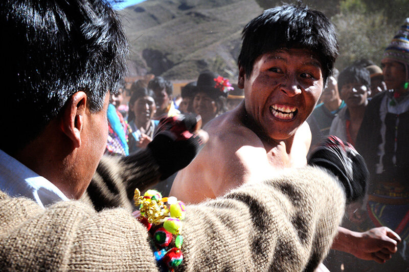 "Тинку" – это вид массового ритуального боя, распространенный в Боливийских Андах в районе Патоси. На языках племен Аймара и Кечуа "тинку" означает столкновение, сходку. В городах Маха, Пакоата и Акасио проходят массовые рукопашные стычки с участием мужчин, женщин и даже детей. Кулачные столкновения устраивают во время христианского праздника, известного как Фестиваль Креста, в честь божества Пачамаму (Мать-Земля). Местные проливают кровь во время столкновений, прося ее благословение на хороший урожай. По мимо кулачных боев на фестивале проходят танцы и музыкальные номера. Люди приносят с собой еду и напитки в том числе алкогольные. Участие в "тинку" носит ритуальный характер, хотя бьются по-настоящему. Изредка бывает и со смертельным исходом. Обычно сражаются руками и ногами, реже используют подручные средства, камни. Итоги битв выглядят печально, люди получают травмы, некоторые умирают. Но смерть вовремя "тинку" является добрым знаком. Местные верят, что это означает хорошие уро