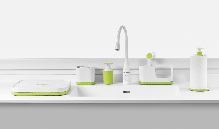 Еще один удобный вариант организации предметов для мытья посуды — полипропиленовая коробка-органайзер, состоящая из трёх деталей. Черно-белый вариант добавит стиля, оливковый и желтый — ярких красок. Супер вариант для содержания рабочего уголка в полном порядке. Губка для мытья посуды на перфорированном поддоне, влаговпитывающая салфетка — на специальной штанге, щётка и флакон с гелем для посуды — в коробке с разделителем. Опрятно и организованно! Судя по отзывам купивших, цена немного завышена, но в целом аккуратная и полезная вещь, купить которую можно тут.
