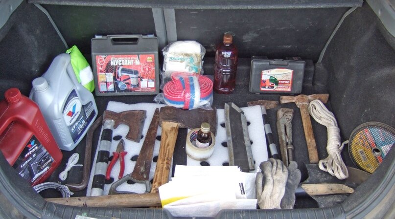 Конечно, в первую очередь, нужно позаботиться о безопасности, поэтому первое, о наличии чего необходимо позаботиться - это огнетушитель и медицинская аптечка. Но есть и другие предметы, которые могут пригодиться во время поездки чаще всего. Конечно, набор таких предметов сильно зависит от марки, возраста, состояния нашей машины и ряда других факторов, но общий набор, как правило, состоит из 6 наиболее часто или наиболее сильно пригождающихся вещей, и вот они: 1. Комплект грязной (тёплой) одежды. 2. Обычный прозрачный скотч. 3. Влажные и сухие бумажные или текстильные салфетки или тряпки (желательно чистые). 4. Огнетушитель. 5. Наличные деньги. 6. Запас антифриза для его полной замены. Кроме того, чем старше Ваш автомобиль, тем более вероятно Вам могут пригодиться также набор инструментов, состоящий из наиболее часто используемых ключей (в том числе "головок") и набор для "прикуривания" аккумулятора.