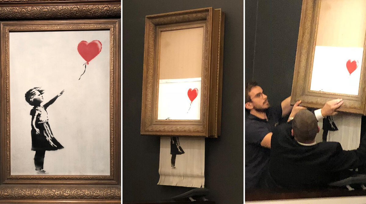 Картина популярного художника Бэнкси само уничтожилась прямо после покупки на аукционе. Оказалось, что в позолоченной рамке которая по загодочным требованиям художника была неотъемлемой частью лота был встроен шредер измельчивший картину на кусочки на глазах у участников. "Девочка с воздушным шаром" считается одной из самых популярных и узнаваемых работ Бэнкси посвящённая памяти о детях, погибших в Сирии, и в поддержку беженцев. Известно, что картина была выполнена в единственном экземпляре. Как отреагировал покупатель лота ещё не известно, но по словам многих критиков картина стала ещё уникальнее, что делает ее ещё интересней. "Нас только что отбэнксили", — сказал исполнительный директор аукционного дома Sotheby's Алекс Бранчик. В Sotheby's заявили, что самоуничтожение картины — своеобразное послание Бэнкси, которое означает быстротечность и кратковременность человеческих эмоций в мире социальных сетей. Сам художник процитировал — Пабло Пикассо — и написал: "Каждый акт творения — и