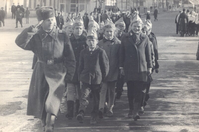 У второго огневого дивизиона, как и у других воинских частей города Магадана, была тесная связь со школьниками города Магадана. На этом снимке магаданские пионеры с шефом сержантом.