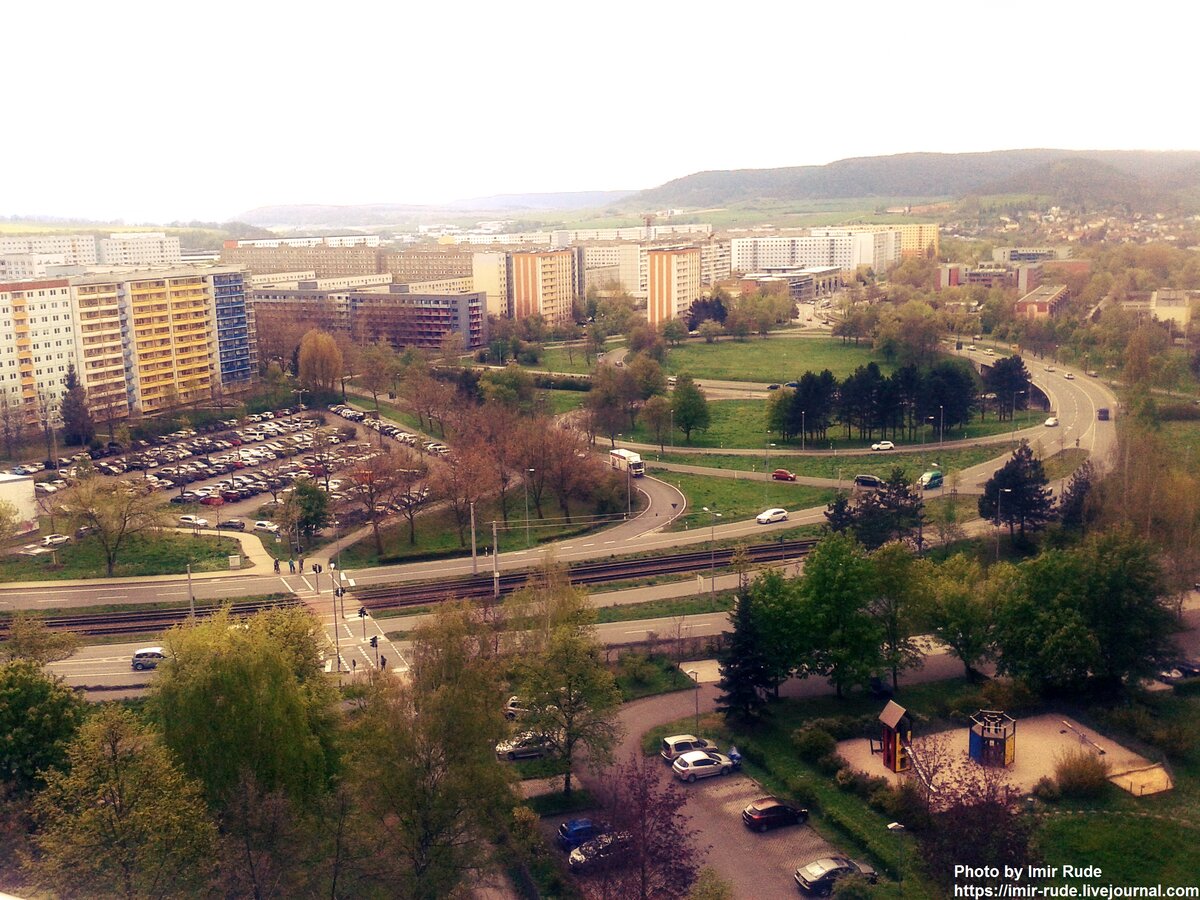 В прошлый раз я рассказывал о том, как немцы ремонтируют старые пяти- и шестиэтажные дома в спальном районе Winzerla. Теперь давайте отправимся в другой район - Lobeda, где живет очень много переселенцев из Турции и бывшего СССР. Вот так Lobeda выглядит с 11-го этажа. Как видно на фото, здесь тоже повсюду панельные дома, но в отличии от Winzerla, дома тут гораздо выше: от десяти до тринадцати этажей. Большинство домов построены так, что образуют закрытый двор с детскими площадками внутри. Они, кстати, не такие кислотно-яркие, как сейчас ставят у нас. Хотя, возможно детям яркое больше нравится.