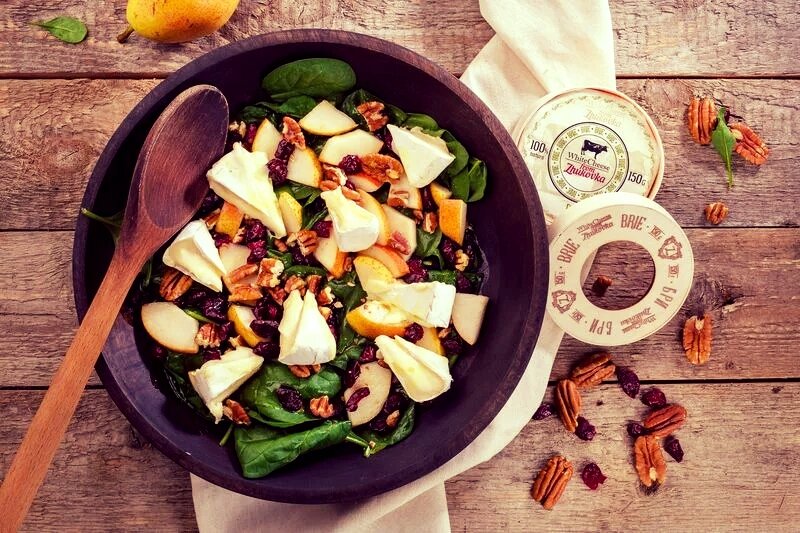 В большой сковороде смешать шампанское, сахар и специи. Довести сироп до кипения на среднем огне, помешивая, чтобы сахар растворился. Груши нарезать толстыми ломтиками, положить в сироп и варить 8–10 минут на среднем огне до мягкости. Остудить. Сыр нарезать небольшими кусочками. Орехи порубить и слегка обжарить на сковороде. В салатницу выложить листья салата. На них выложить грушу, сыр, а сверху посыпать орешками. Перед подачей полить салат бальзамическим соусом.