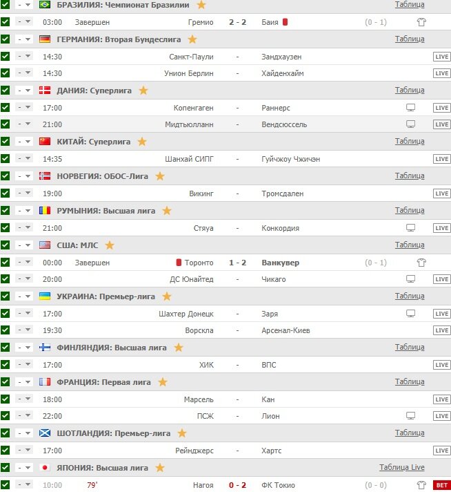 Всем привет. Все нижеприведенные матчи рассматриваю как "верховые" и ожидаю ТБ 2.5 в каждом. Коэффициенты пишу актуальные на момент написания по одинхэбэту. 1. 14:30 Санкт-Паули - Зандхаузен ТБ 2.5 за 2.41 2. 14:30 Унион Берлин - Хайденхайм ТБ 2.5 за 1.96 3. 14:35 Шанхай СИПГ-Гуйчжоу Чжичэн 1-й тайм ТБ 1.5 за 1.72 4. 17:00 Шахтер Донецк - Заря ТБ 2.5 за 1.71 5. 17:00 ХИК - ВПС ТБ 2.5 за 1.89 6. 17:00 Копенгаген - Раннерс ТБ 2.5 за 1.75 7. 17:00 Рейнджерс - Хартс ТБ 2.5 за 1.69 8. 18:00 Марсель - Кан ТБ 3 за 2.0 9. 19:00 Викинг - Тромсдален ТБ 3 за 1.75 10. 19:30 Ворскла - Арсенал-Киев ТБ 2.5 за 2.28 11. 20:00 ДС Юнайтед - Чикаго ТБ 3 за 1.72 12. 21:00 Мидтьюлланн - Вендсюссель ТБ 3 за 1.81 13. 21:00 Стяуа - Конкордия ТБ 2.5 за 1.74 14. 22:00 ПСЖ - Лион ТБ 3.5 за 1.80