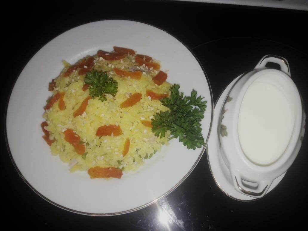 Салаты с курятиной обычно готовят на различные праздники. Этот салат можно готовить хоть каждый день. Салат делается легко и быстро, а также содержит достаточно калорий, что делает его сытным блюдом. Курица отлично сочетается с различными фруктами и овощами, а также с укропом, петрушкой и орехами. Ингредиенты: 25 г маринованных шампиньонов (резанные) 20 г копченой грудки 20 г свежего огурца 25 г сваренного картофеля 10 г свежей петрушки 5 г кураги 5 г семян кунжута 2 г соли 15 г йогурта без добавок Сложность приготовления: легко Время приготовления: 20 минут Шаг 1 Копченую курицу нарезаем тонкой соломкой. Курагу моем, нарезаем соломкой. Шаг 2 Огурец моем нарезаем тонкой соломкой. Шаг 3 Вареный картофель очищаем, нарезаем тонкой соломкой. Шаг 4 Все выкладываем горкой, добавляем соль, украшаем курагой, посыпаем кунжутом. Йогурт подаем отдельно. Пробуем, делимся впечатлениями! Приятного аппетита! Читайте также: Будем рады, если вы оцените данную статью лайком. Вы можете так же сделать р