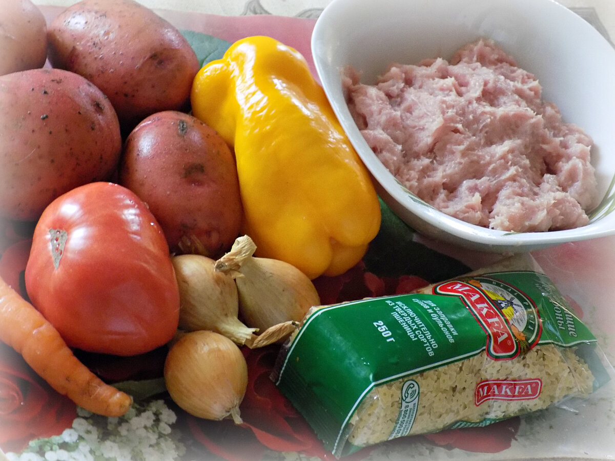 Приветствую всех моих читателей! Суп с фрикадельками один из самых любимых первых блюд как у детей, так и у взрослых. Добавить в него можно совершенно разные ингредиенты в зависимости от вкусовых предпочтений и наличия продуктов под рукой. Сегодня я поделюсь с вами одним из вариантов приготовления быстрого супчика с фрикадельками и звездочками. Нам понадобится: фарш мясной 300 грамм картофель средний 4-5 шт лук репчатый средняя морковь помидор сладкий перец макаронные изделия 40-50 грамм 3 литра питьевой воды соль по вкусу приправа хмели-сунели ( либо другая подходящая) Приготовление. Для начала сделаем фрикадельки для супа. В мясной фарш добавляем по вкусу соль, молотый перец и приправу, подходящую для фарша, можно взять универсальную. Также вливаем полстакана питьевой воды и тщательно вымешиваем, чтобы получилась однородная масса. Из готового фарша формируем фрикадельки примерно одинакового размера. Чтобы легче было их сделать руки периодически смачиваем водой, тогда фарш не буде