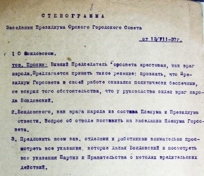 Павел Лещенко провел историческую параллель с грядущим увольнением Главы города Евгения Арапова: "Говорят, в понедельник депутаты оренбургского горсовета обсудят вопрос увольнения главы города Арапова. Потому что он оказался взяточником. А может, и не оказался, приговор-то еще не вынесен, но все равно, надо его с работы снимать. В связи с этими событиями вспоминается одна история. В общем, садитесь, деточки, в кружок, дядя Паша расскажет вам… Нет, не сказку. Быль. Давным-давно, в 30-х годах, управлял городом Орском человек по фамилии Бондовский. Хорошо ли, плохо ли управлял, мы не знаем, да это и не важно. Важно то, что в июле 1937 года его арестовали по обвинению во вредительстве. Точная дата ареста неизвестна, но 1 июля он еще проводил заседание горсовета, а 13 июля его коллеги уже собрались на экстренное заседание, на котором под пунктом 1 значился вопрос с лаконичной формулировкой «О Бондовском». Депутаты сняли его с должности, исключили из президиума и даже немножко покаялись, не